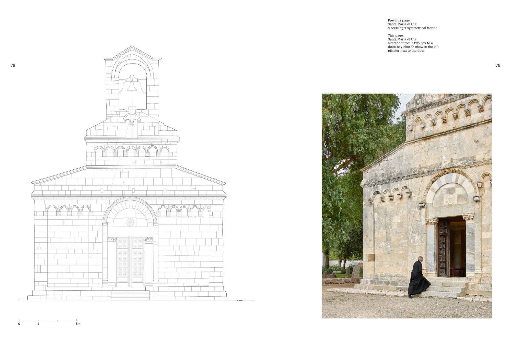 Le caractère des églises romanes de Sardaigne est spécifique au lieu et aux circonstances de leur origine et de leur survie continue. Rencontrées aujourd'hui comme des objets solitaires dans le paysage, bien que certaines faisaient autrefois partie d'ensembles monastiques plus vastes, ces structures d'apparence simple transmettent à la fois fragilité et endurance. Construites en pierre locale, les façades sont détaillées et sculptées en bas-relief, souvent l'œuvre d'artisans étrangers – des maçons itinérants d'Afrique du Nord, de France et d'Italie continentale. Les façades représentent colonnes et poutres, images sculptées qui ne jouent aucun rôle structurel, leur détail et relief étant une projection délibérée de leur importance et position dans la communauté et de leur place dans le paysage environnant. Les intérieurs simples et dépouillés sont définis par la pierre dont ils sont faits, les ombres fraîches de leur intérieur résultant de la masse et de l'inertie du matériau lui-même, leur forme modifiée pour s'adapter au sol sur lequel ils reposent et répondre au paysage environnant.