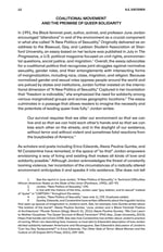 « Notre survie exige que nous modifions notre environnement pour que nous puissions vivre, pour que nous puissions nous tenir la main et pour que nous puissions nous embrasser dans les rues, à la lumière du jour de notre existence, sans terreur et sans réactions violentes et parfois mortelles de la part des personnes indiscrètes d'Amérique. »