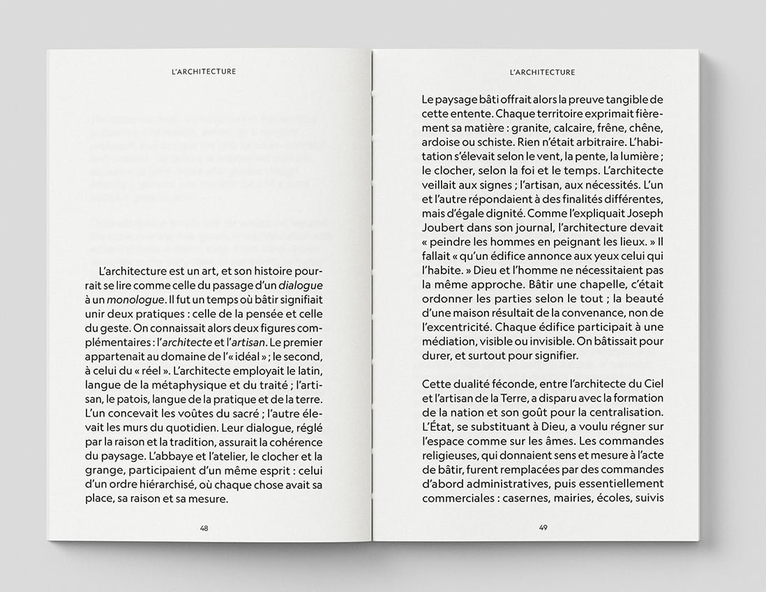 'Il est compliqué aujourd’hui de prononcer le mot « architecture » sans éprouver un malaise, voire une lassitude. Le terme a été vidé de sa substance, employé pour désigner tout et son contraire. Il n’indique plus une pensée, mais une posture ; non plus une exigence, mais une complaisance. L’anarchie du milieu architectural n’est pas seulement formelle : elle est d’abord intellectuelle. On y confond la création avec la mode, la transmission avec la communication, la fin avec les moyens. Ce monde ne cherche plus la vérité des choses, mais leur rentabilité et leur distraction, aussi éphémères soient-elles. L’architecture s’est faite servante de la puissance et de la reconnaissance. Elle ne bâtit plus pour l’humain, mais pour un marché abstrait, globalisé et obsédé par la quantité.