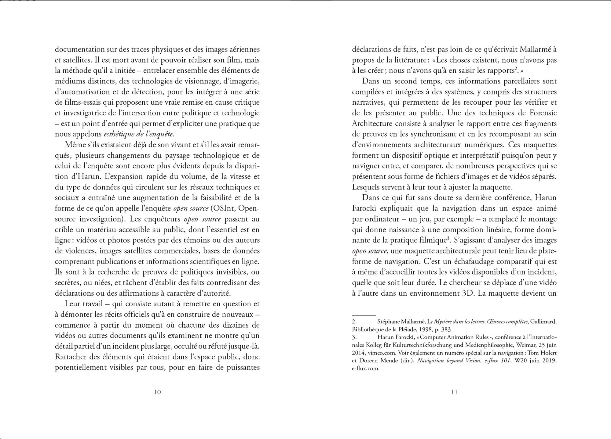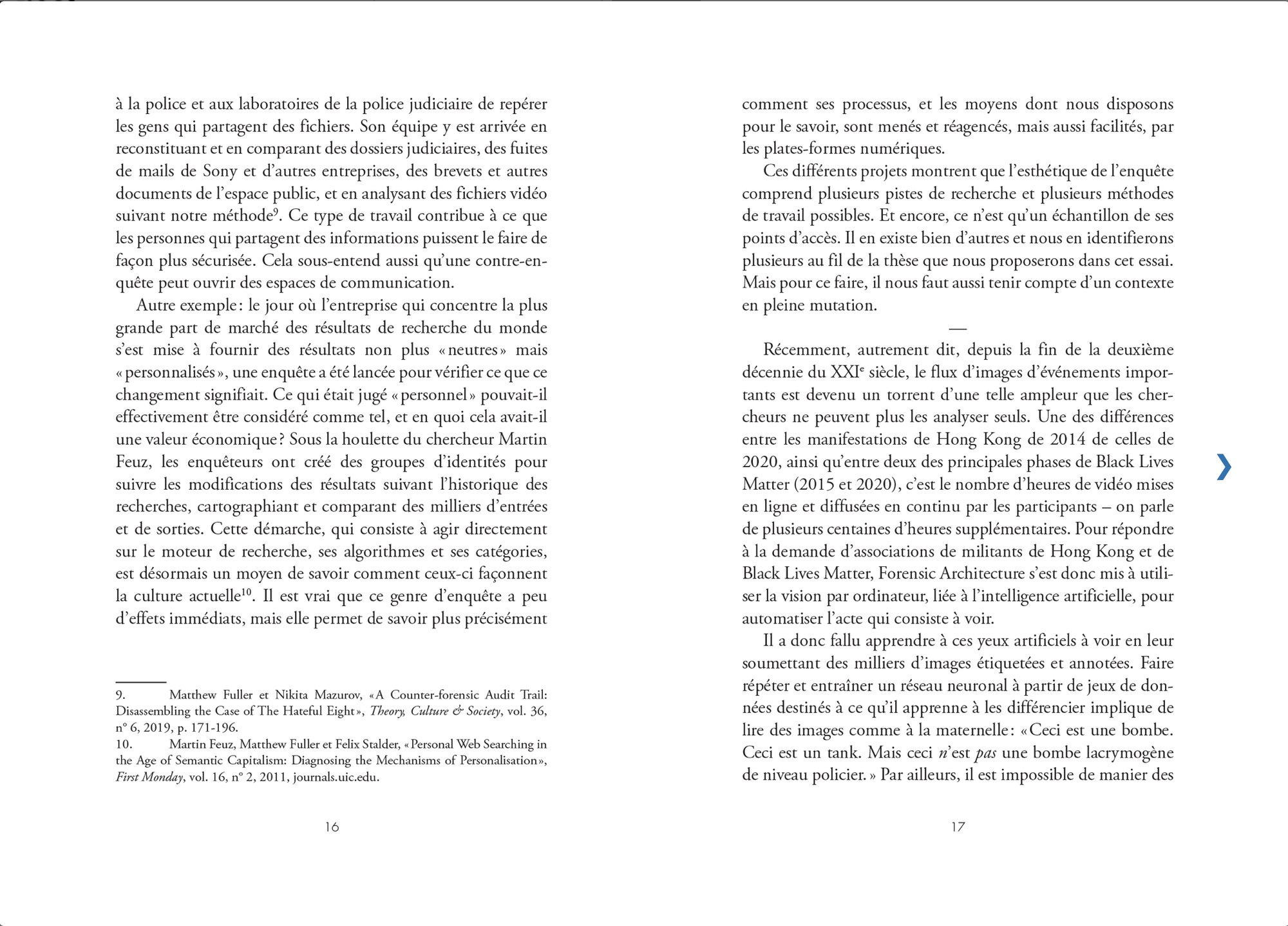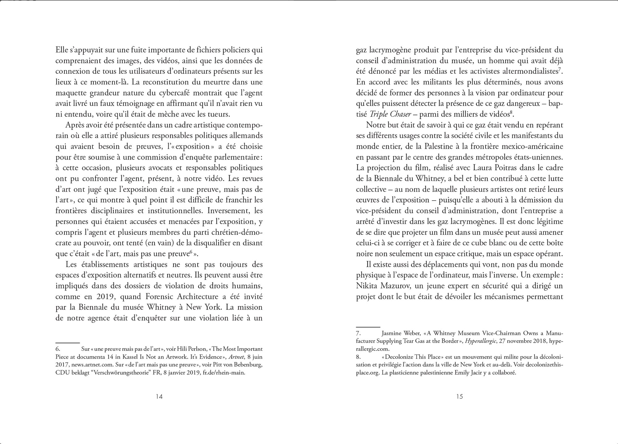 Au cœur du livre se trouve l’expérience de Forensic Architecture, groupe de recherche fondé par l’architecte Eyal Weizman à Goldsmiths, Université de Londres. En mobilisant des méthodes issues de l’architecture — analyse spatiale, reconstruction tridimensionnelle, lecture des traces matérielles — leurs enquêtes remettent en question des récits officiels et contribuent à la production de preuves dans des contextes juridiques, médiatiques et politiques. L’espace y devient un médium d’investigation, capable de révéler des faits invisibles ou contestés.